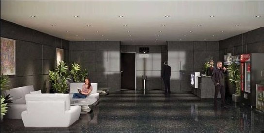 تشكل المساحة الواسعة بين المبنيين التجاريين المدخل الكبير للمناطق السكنية والمشتركة في المشروع